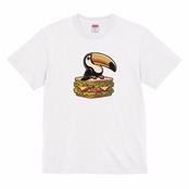 カフェ「どうぶつトッピング」の新しいスター、トゥーキーというオオハシが、サンドイッチの上でくつろいでいます。